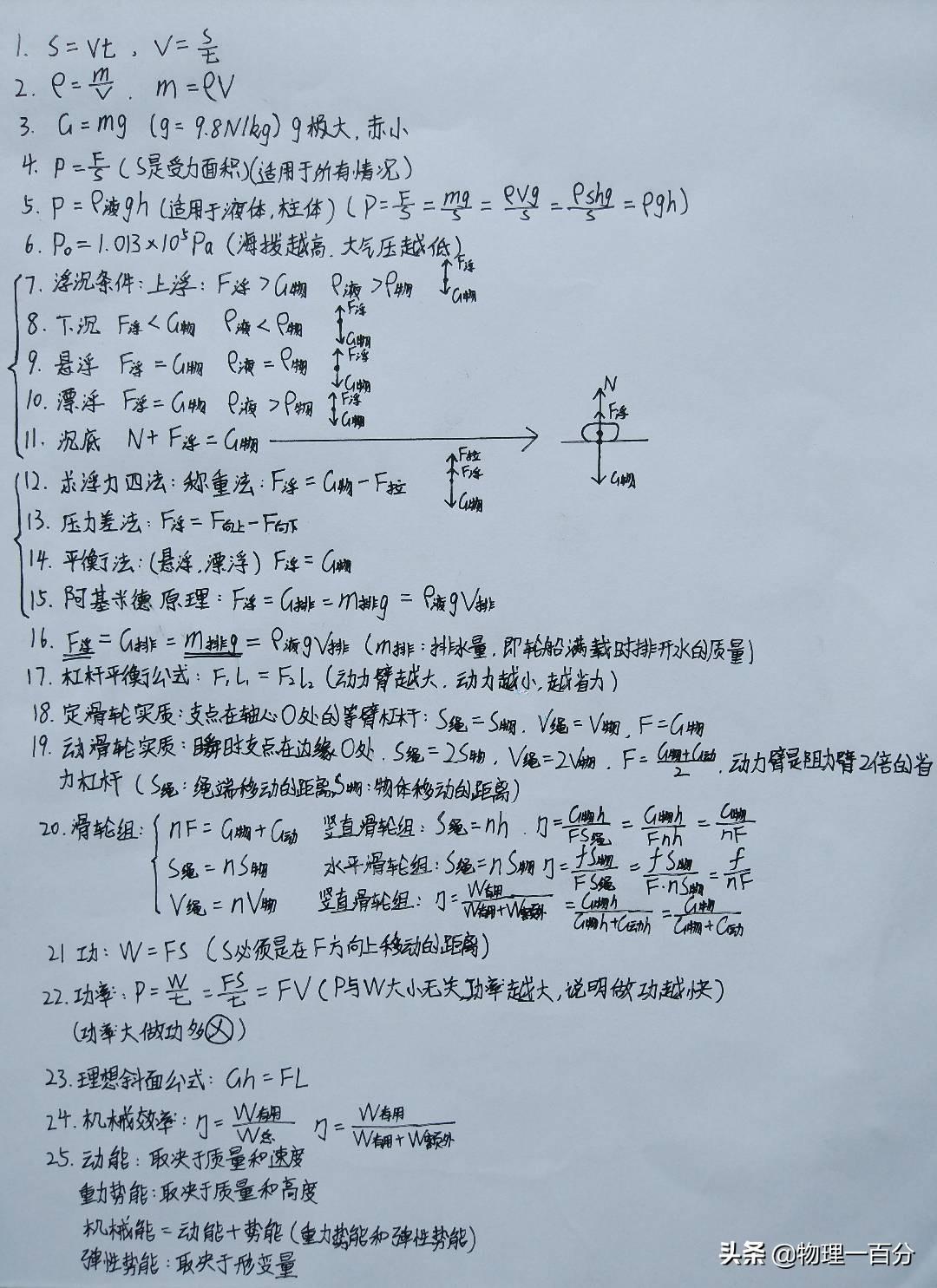 九、优秀的初中生总有你想不到的好方法! 下方这两张图概括了几乎全部初中物理最重要物理公式,一张全面的力学公式图、一张全面的电学公式图,初中物理的核心知识全在这里了,由此可以生发出全部初中物理知识,把物理书由厚变薄,最好的学法之一!