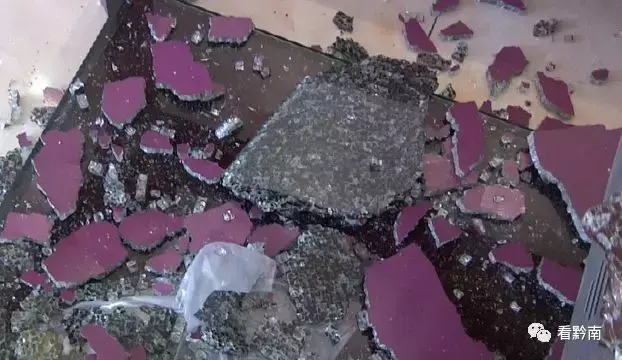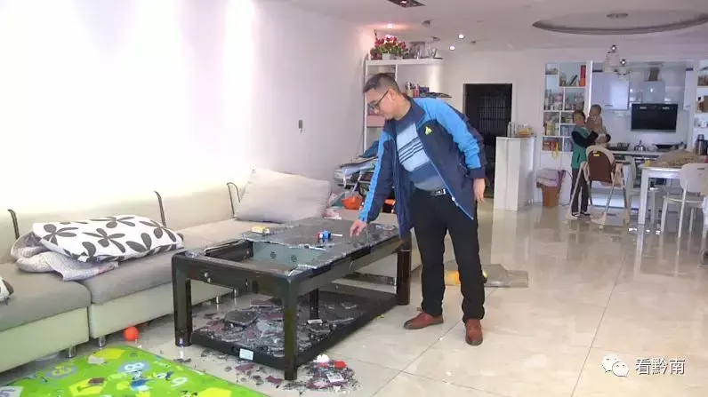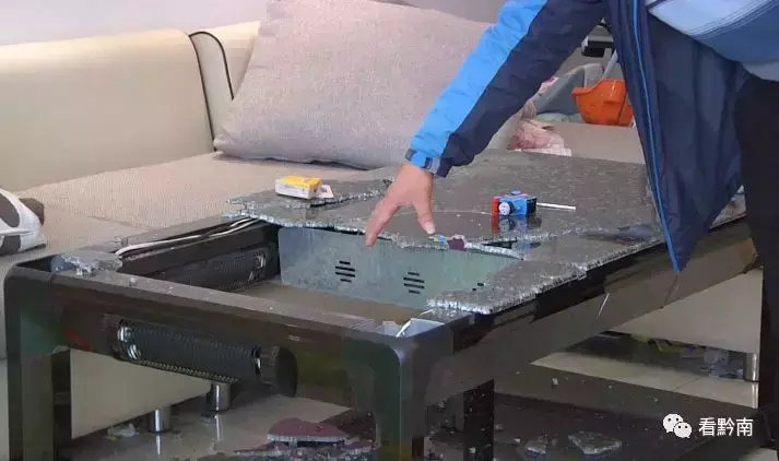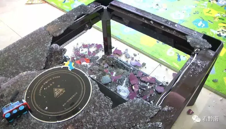 记者看到,这台茶几式电暖炉,钢化玻璃几乎全部碎裂,中间还出现了一个大窟窿,破碎的面板玻璃散落一地。