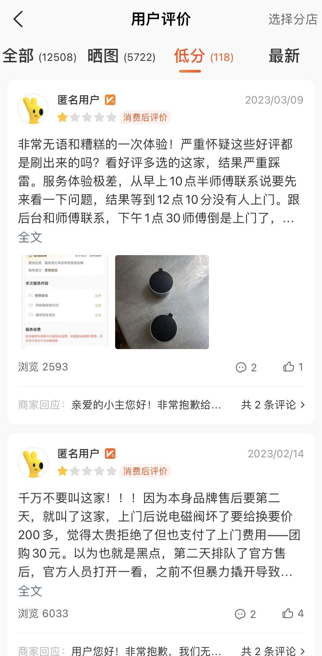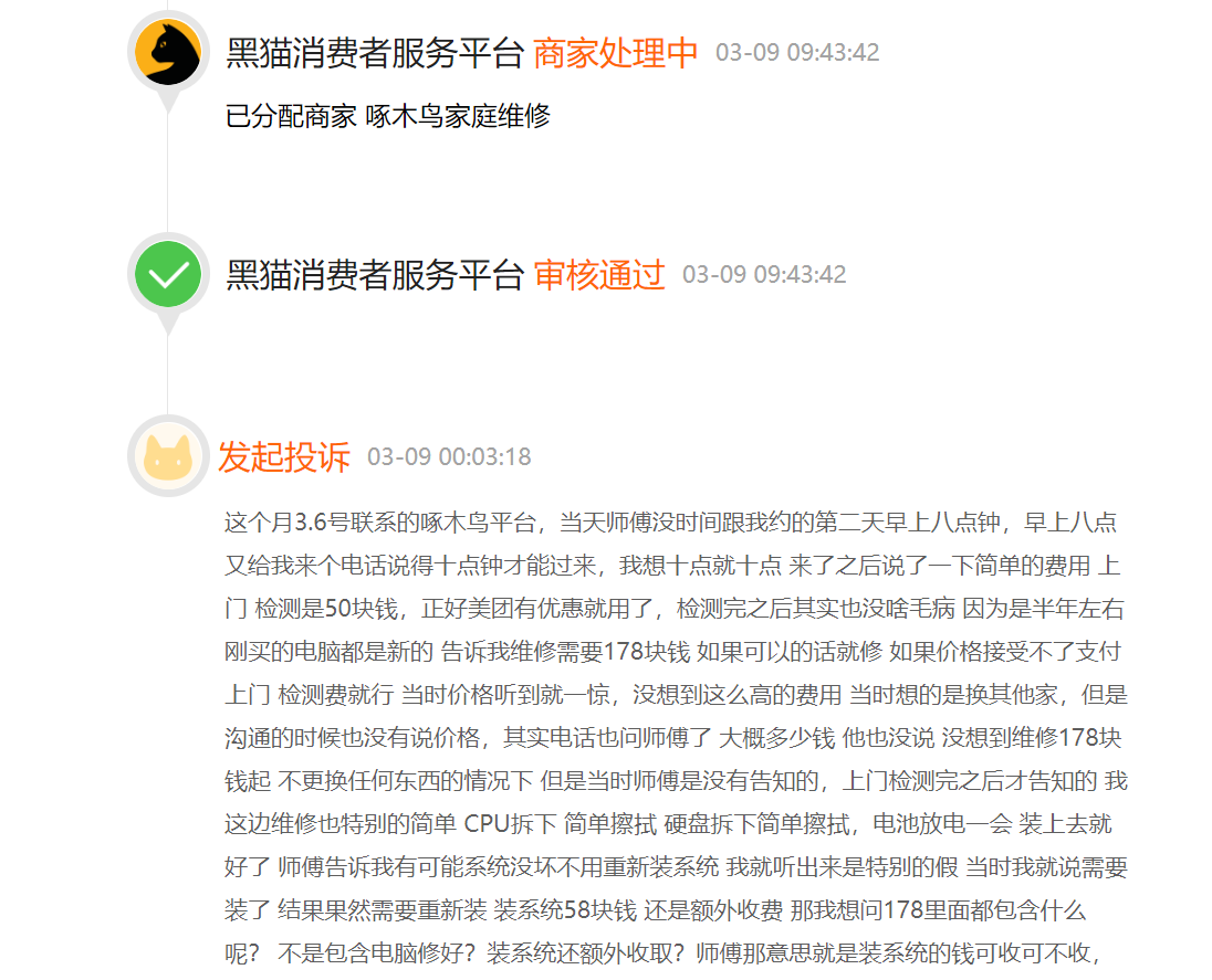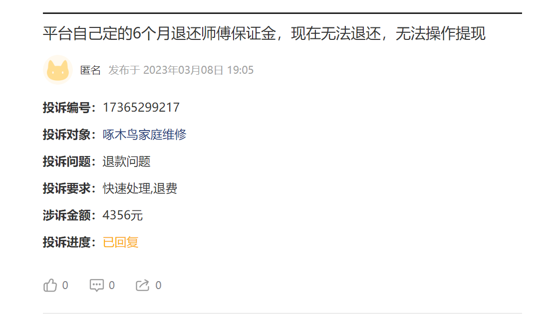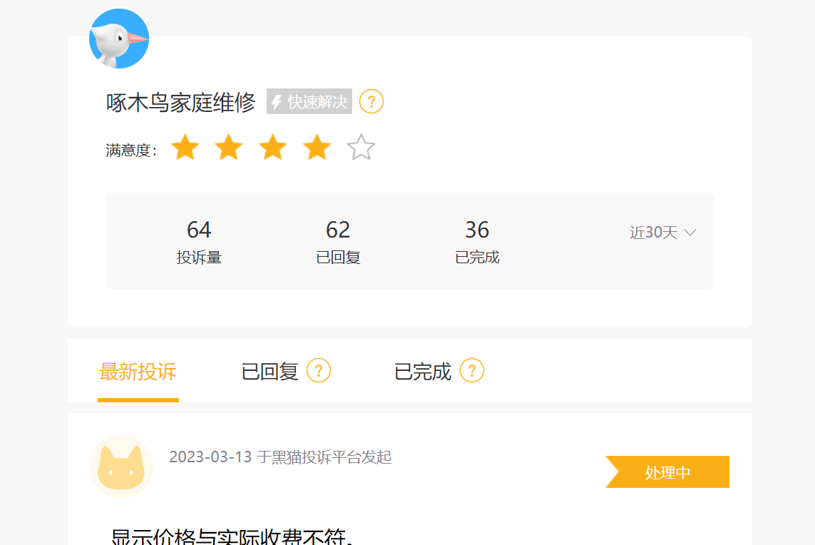 3月13日,记者在黑猫投诉平台上查询到,关于啄木鸟家庭维修的投诉,近一月内有64起,且大部分客户投诉维修定价过高,要求退还不合理收费;同时,也有多位离职维修师投诉该平台逾期未退还保证金的情况。另外,在美团、天猫、京东等电商平台的啄木鸟维修旗舰店,点评反映收费不合理的网友均不少。