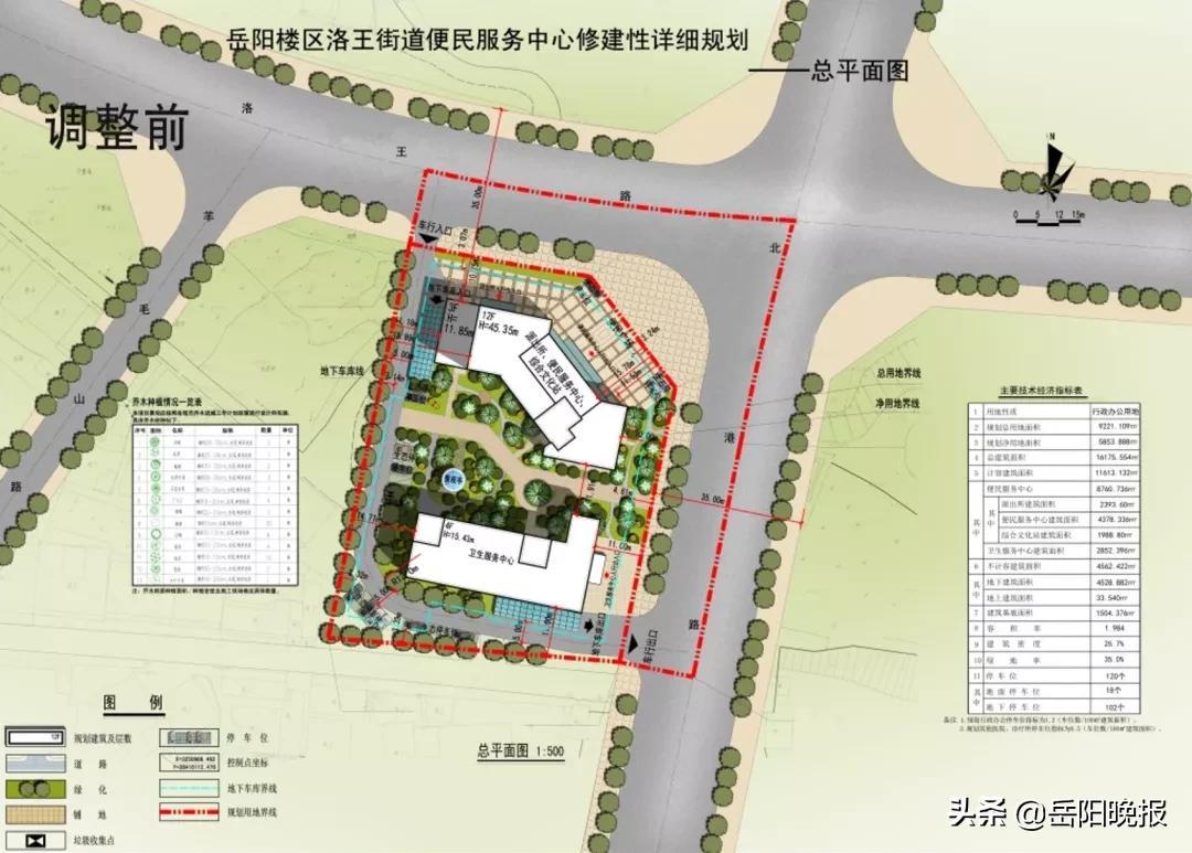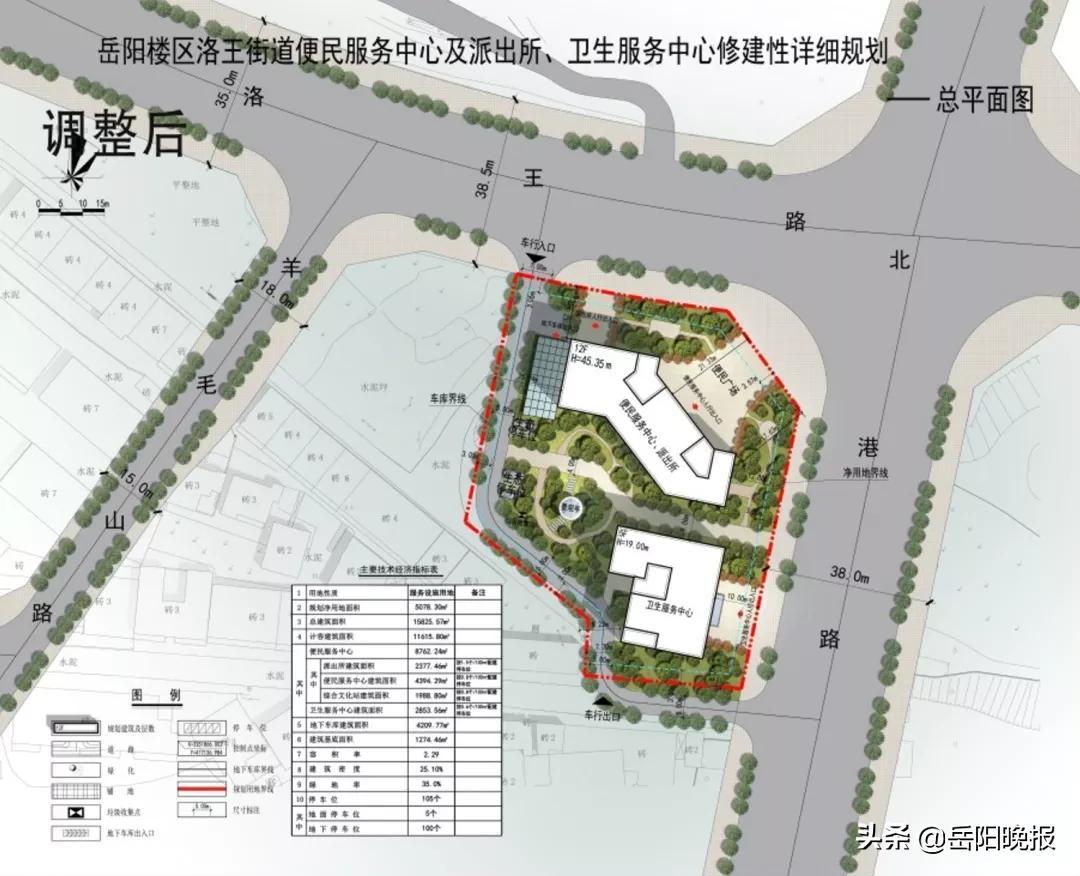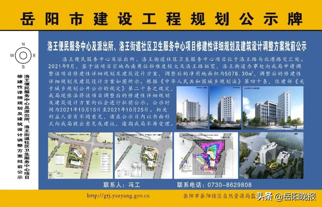 10月15日,岳阳市政府官网发布《洛王便民服务中心及派出所、洛王街道社区卫生服务中心项目修建性详细规划及建筑设计调整方案批前公示》 ,洛王街道办事处向岳阳市自然资源和规划局申请调整该项目修建性详细规划及建筑设计方案,调整后的净用地面积为5078.30㎡。