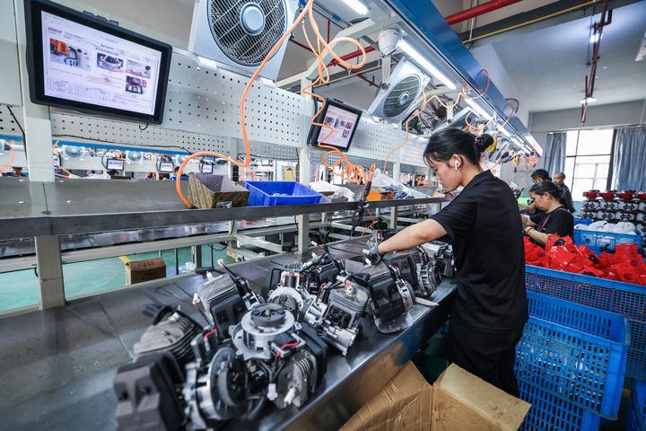 2024年8月14日,在位于金华市的浙江托马斯工具制造有限公司数字化车间内,工人在流水线上生产出口的园林机械。新华社记者 徐昱 摄