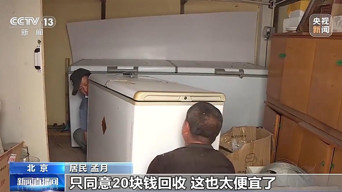 居民 孟月: 这冰箱当时买的时候花了1000多,用了三四年了,现在看起来有点小了,确实有点老了,想换个新一点的,但是找了回收人员,只同意20块钱收货,这太便宜了。