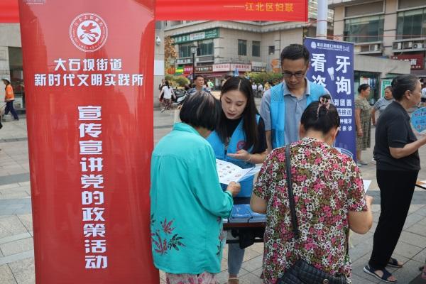 9月27日上午,江北区妇女联合会携手大石坝街道在元佳广场开展了“我和祖国共奋进 巾帼同心庆华诞”主题文化宣传志愿活动,以宣讲、赞歌、情景剧、舞蹈、快板等“文艺+”形式歌颂祖国。