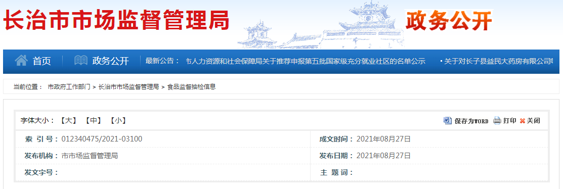 中国质量新闻网讯 2021年8月27日,山西长治市市场监督管理局网站发布2021年食品安全监督抽检信息公告(第4期)。