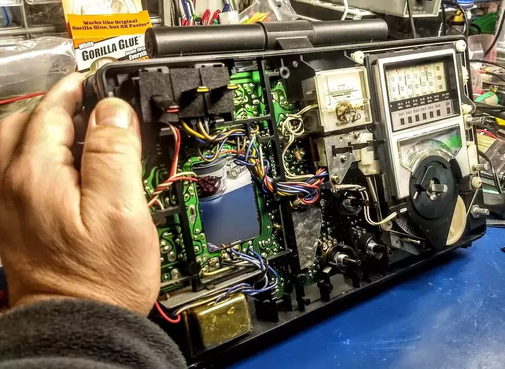 弗拉多熟悉RF-2200,因为这台机器不是最简单的无线电设备,所以我请求他帮忙解决。在把收音机交给他的几秒钟之内,他插上电源,测试开关和电位器,然后取下后盖(断开电池盒引线),然后拆下前盖(断开扬声器引线)。