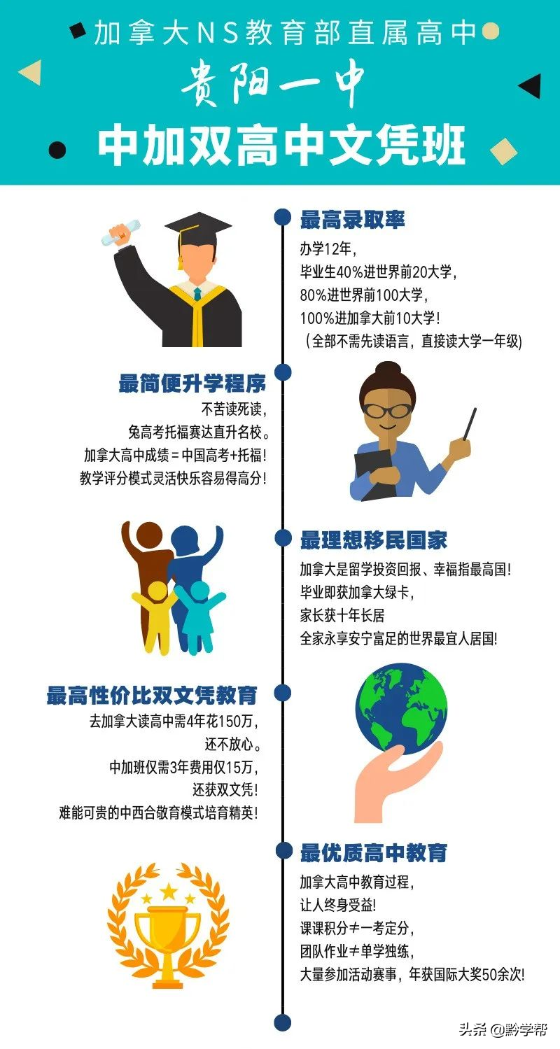 经中加两国教育部门严格审批,贵阳一中中加班与加拿大NS教育部于2009年创立我省唯一加拿大NS教育部直属“学历”高中 。学生入读贵阳一中中加班后具有贵阳一中和加拿大NS教育部两国高中学籍 ,三年修读两国高中课程,参加两国省考,获两国高中文凭 。高三毕业以加拿大高中生身份及加方成绩,免高考/赛达/AP/ALEVEL等标化考试快捷稳妥直升海外顶尖名校。