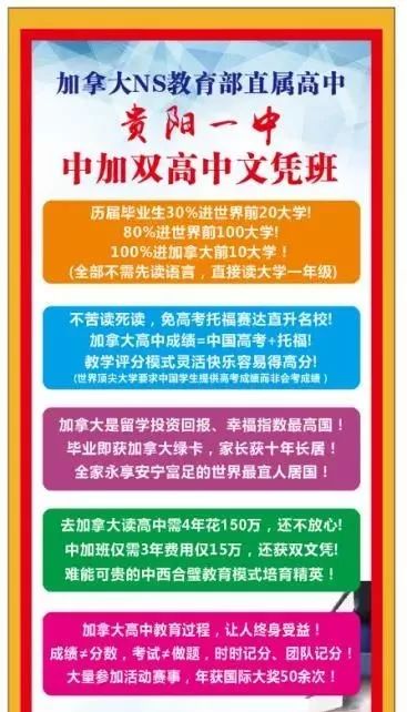* 去加拿大读高中需要四年花费120-150万,贵阳一中中加高中仅需三年,仅需15万,节约一百多万。