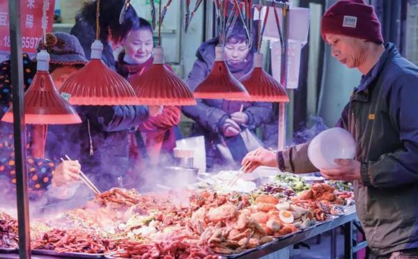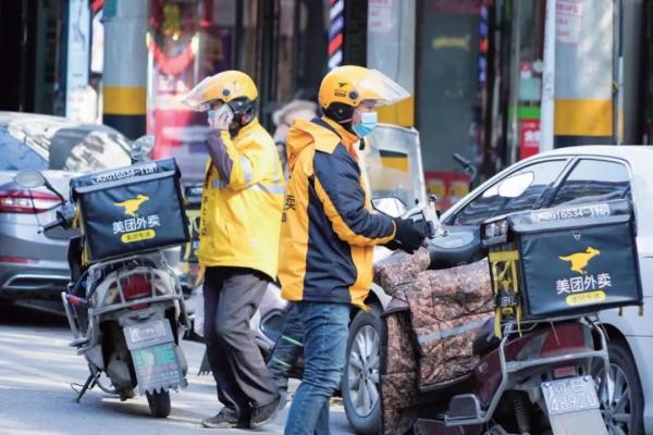 广场路上,外卖小哥迎来一天中最忙碌的时间。