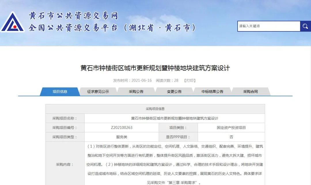 根据市政府工作安排,钟楼地块已纳入城市重点更新改造任务,为更好地指导钟楼地块的开发建设,补齐城市功能短板,激活钟楼街区,提升城市形象和塑造城市特色,黄石港区人民政府组织开展《黄石市钟楼街区城市更新规划暨钟楼地块建筑方案设计》招标工作。