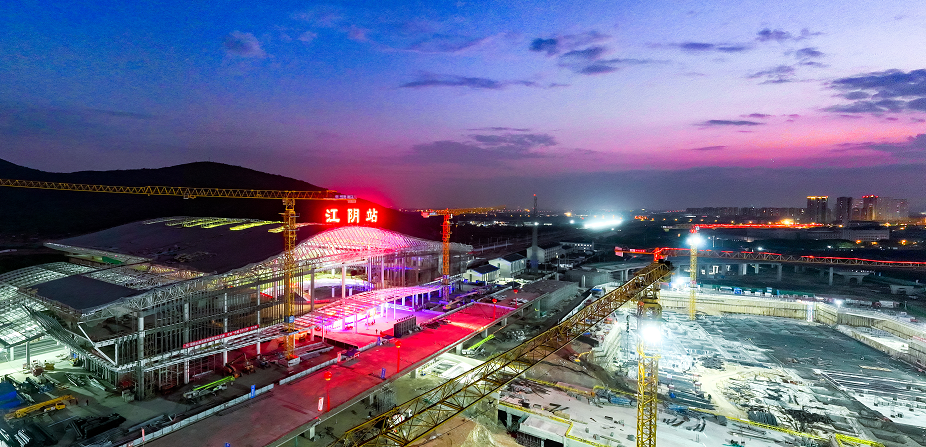 南沿江铁路江阴段完成铺轨,“江阴站”三个红色大字组成的站房铭牌高高竖起。