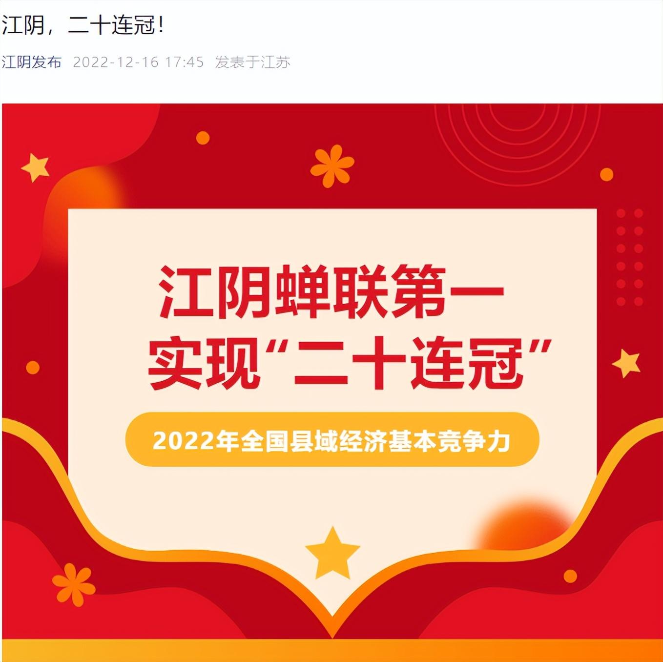 2022年全国县域经济基本竞争力排名揭晓,江阴蝉联第一,实现“二十连冠”。
