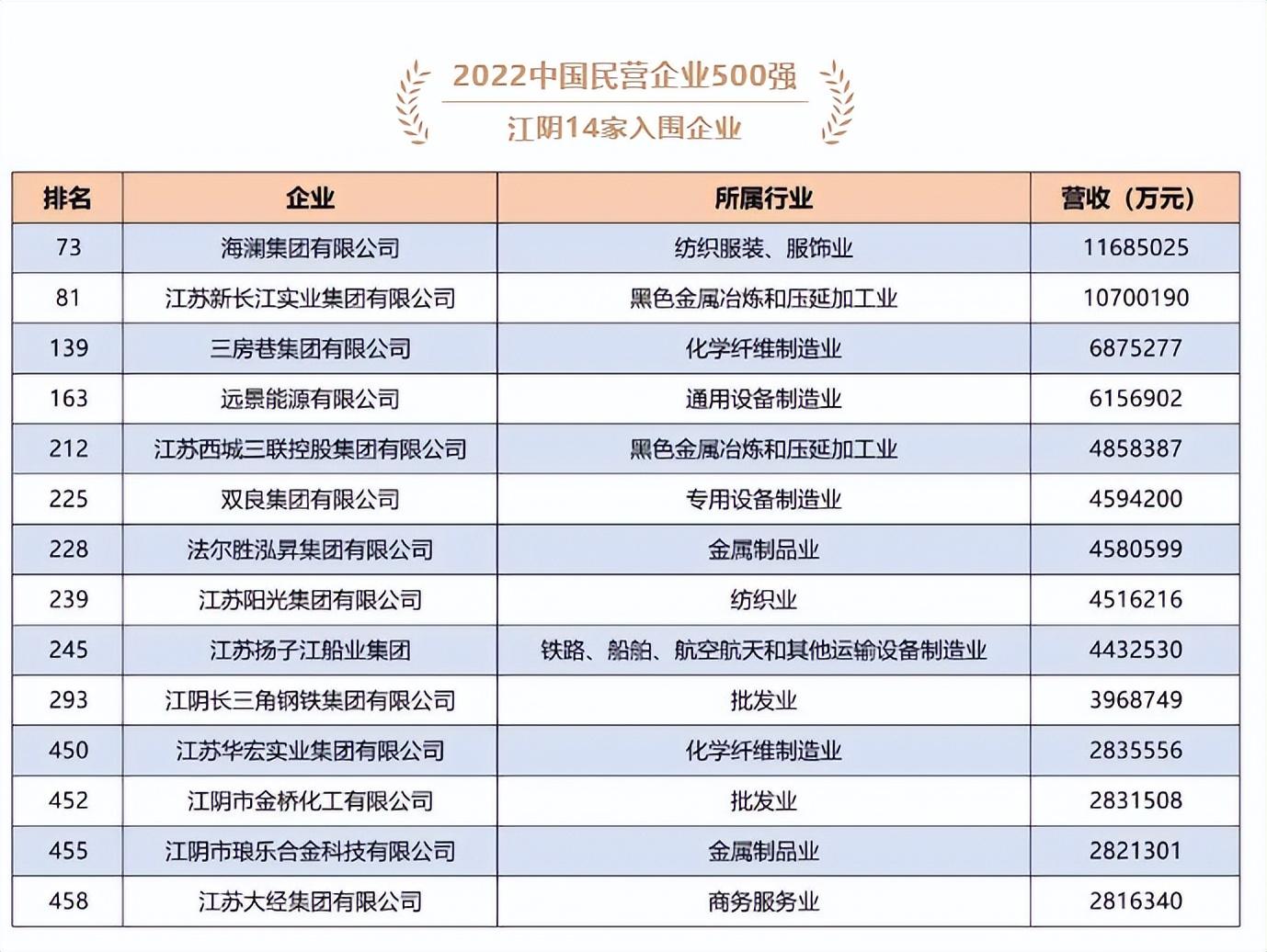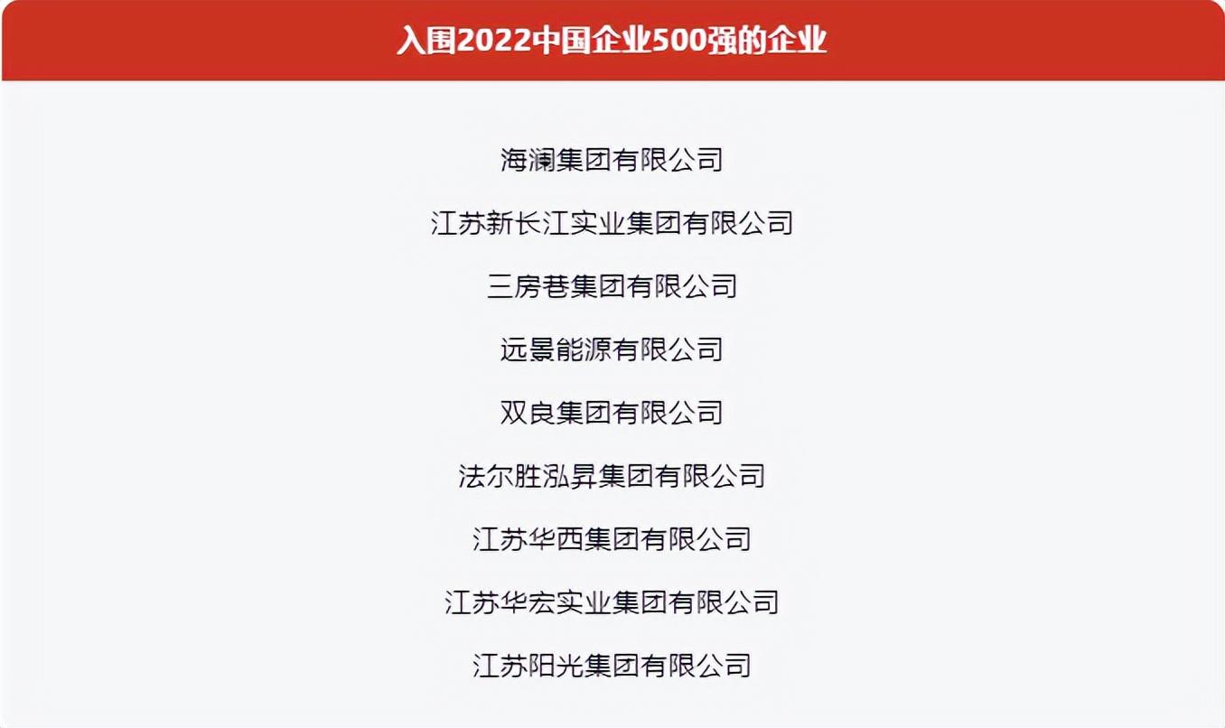 2022中国企业500强,江阴9家企业入围。2022中国民营企业500强,江阴14家企业入围。
