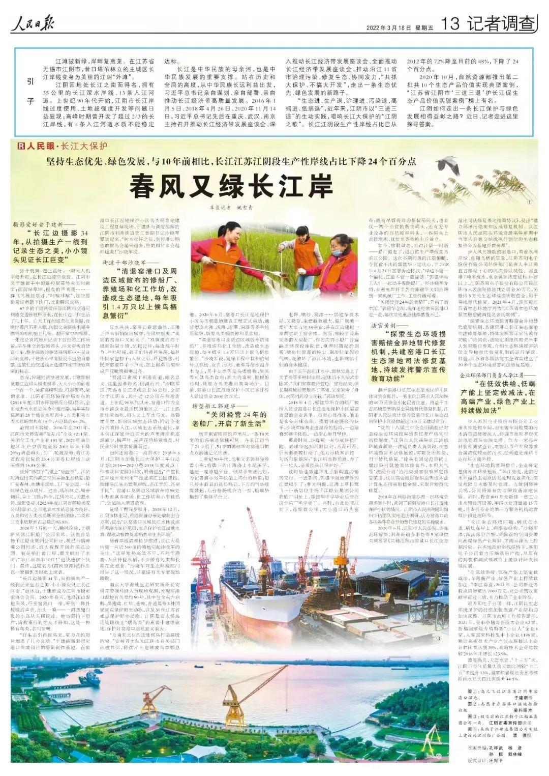 江阴获评第六批国家生态文明建设示范区。3月18日,《人民日报》以整版篇幅聚焦长江大保护的“江阴之歌”。
