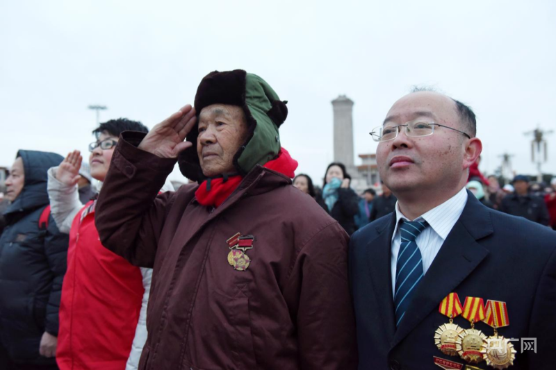 2017年,钱海军和志愿者们带着“老人旅行团”,到天安门广场观看升国旗,圆老人们的梦想(央广网发 岑益冬 摄)