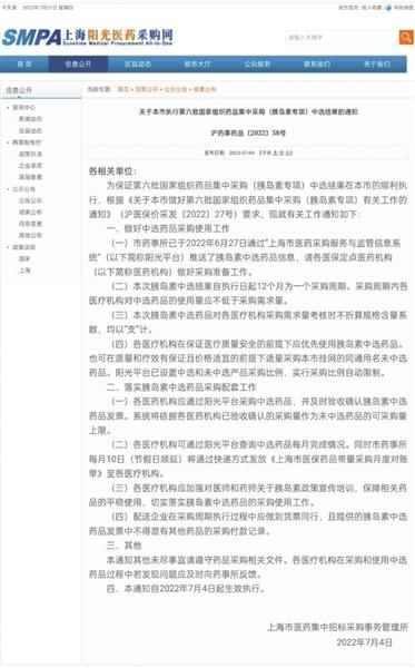 7月4日,上海阳光医药采购网宣布开始执行胰岛素集采,至此全国31个省份的胰岛素集采全面开始执行。上海阳光医药采购网截图