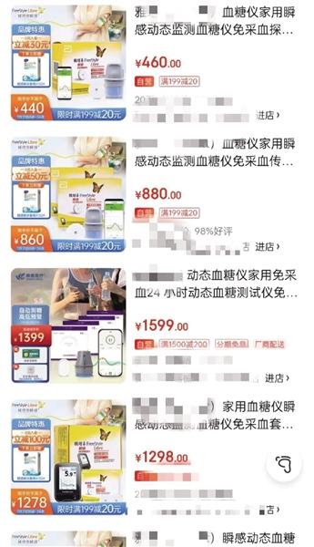 某电商平台售卖的动态血糖仪探头,价格从几百元到上千元不等,对于部分患者是经济负担。电商平台截图