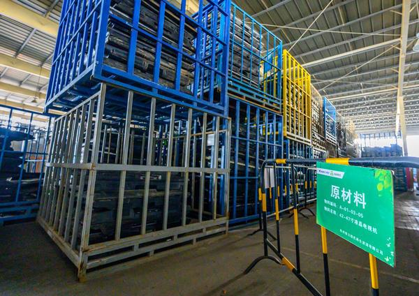 质检结束后,贴好了“身份证”的旧家电们会被放置进统一规格的工装笼中入库保存,等候驾驶叉车的师傅们,把它们送至相应的拆解流水线。