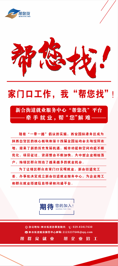 为做好辖区群众的就业工作,满足招聘单位用人需求,搭建用人单位和求职者的双向选择平台,新合街道就业服务中心“帮您找”平台将近期企业用工信息汇总发布,请有需要的群众与街道就业服务中心联系。