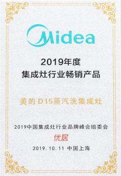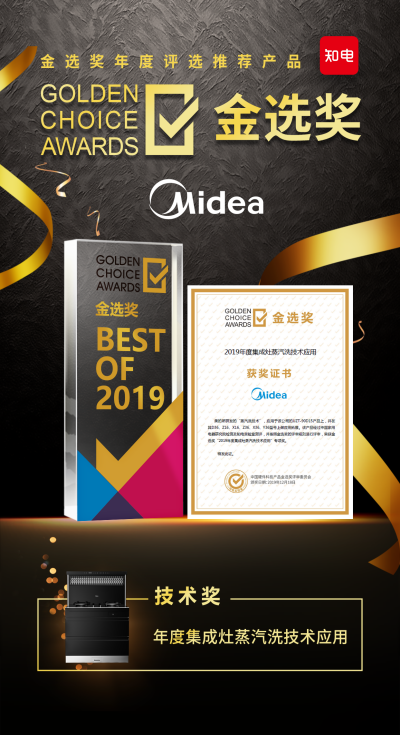 2019年12月18日,在第五届中国智慧家庭大会上,美的集成灶蒸汽洗技术一举荣获"2019年度金选奖" 。