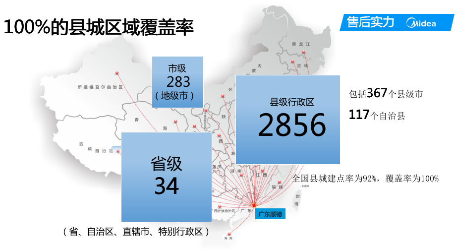 同时,美的拥有强有力的品牌综合服务能力以及全国各地的6000多个服务网点,100%的县城区域覆盖率,真正做到"客户满意"的服务目标。