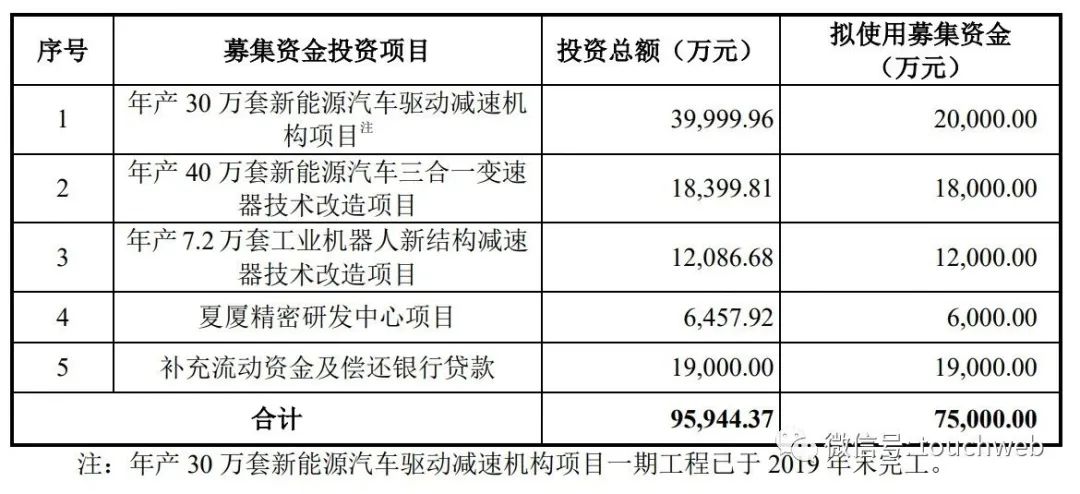 其中,2亿元用于年产30万套新能源汽车驱动减速机构项目,1.8亿元用于年产40万套新能源汽车三合一变速器技术改造项目,1.2亿元用于年产7.2万套工业机器人新结构减速器技术改造项目,6000万用于夏厦精密研发中心项目,1.9亿元用于补充流动资金及偿还银行贷款。