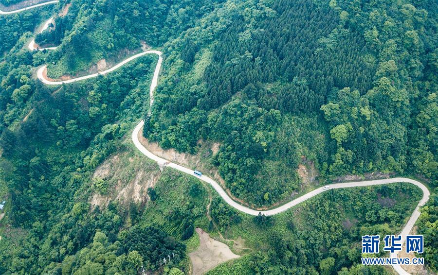 “通村村”车辆行驶在贵州省雷山县大塘镇的乡村公路上(5月24日无人机拍摄)。 新华社记者 陶亮 摄