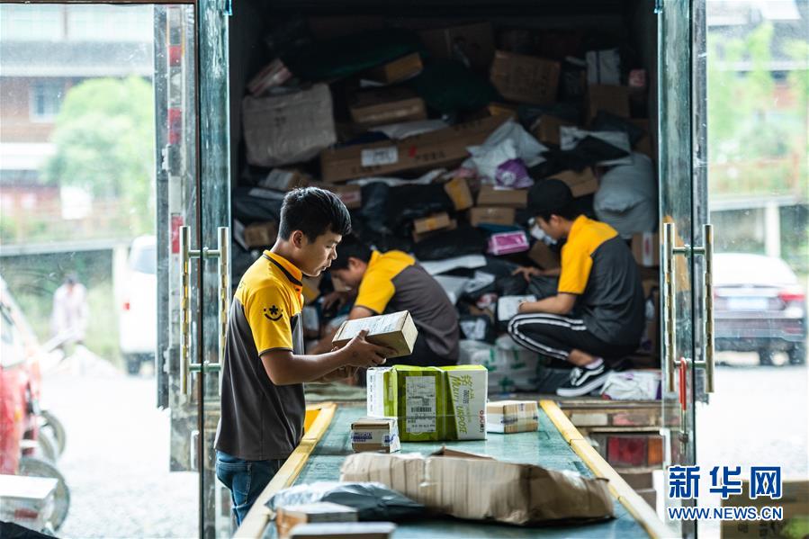 快递员在贵州省雷山县“通村村”调度中心分拣包裹(5月24日摄)。新华社记者 陶亮 摄
