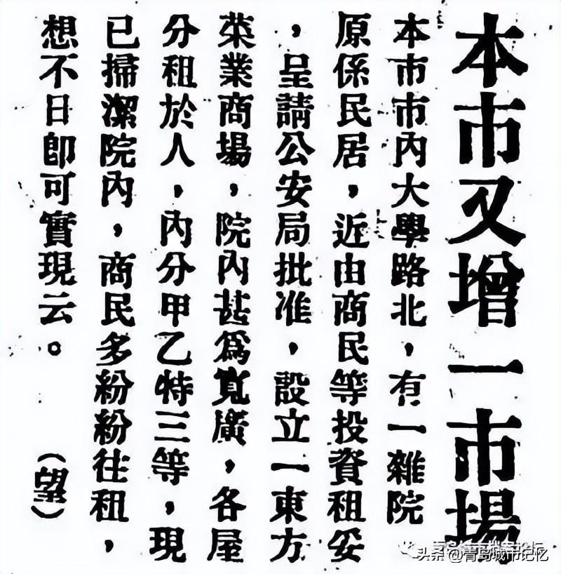 1930年1月17日《青岛快报》文章:商民投资在大学路北设东方菜业商场。(资料图片)
