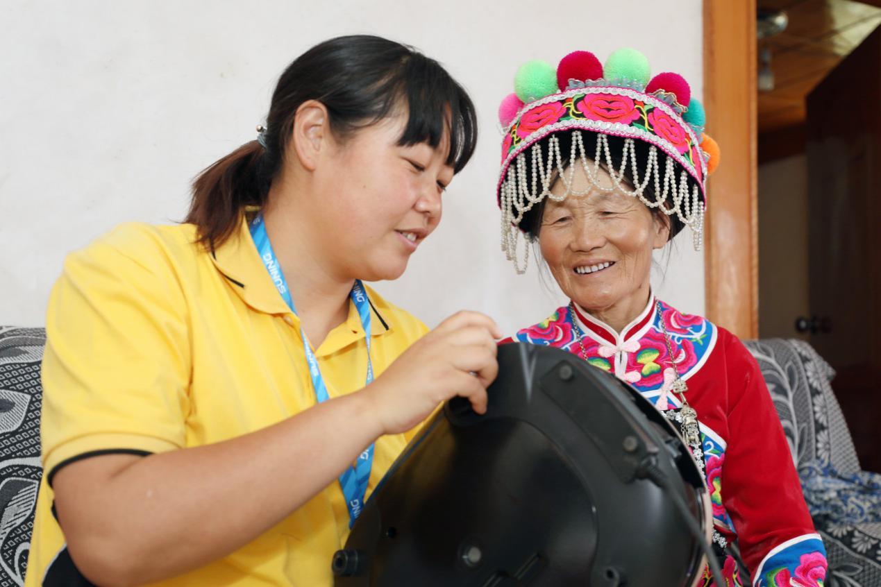 在大姚,不识字、看不懂说明书的老人很多,收到子女送的电器却不会用,龚晓娟就想着要教会他们使用之后再离开,碰上耳背的老人她还会用记号笔标注好。她甚至还成了半个电工,谁家的电器出故障了都会盼着龚晓娟送货上门,龚晓娟也愿意小试牛刀,因为她喜欢看到修好后老乡冲她笑的样子。