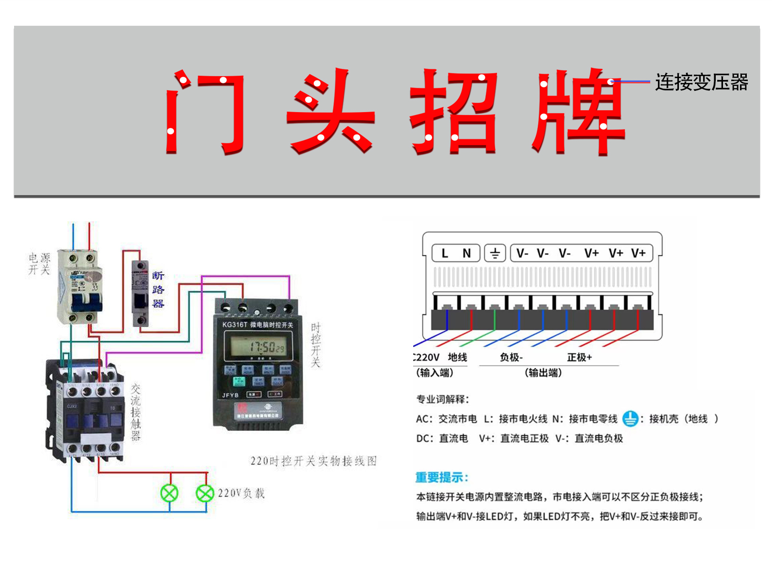 2、变压器问题:检查变压器指示灯是否亮起,断电后重新给电查看变压器是否短路或过热保护。如果变压器有问题自己自己去广告材料店买一个或是淘宝价格不等,建议购买60-80元太贵没必要。拿到变压器我们一定要区分怎么接线,不要把交流和直流接错了以及直流正负极不要接反了。大家也可以给自己的变压器拍个照片,淘宝购买差不多的按照之前顺序安装更换变压器一定要关闭开关;