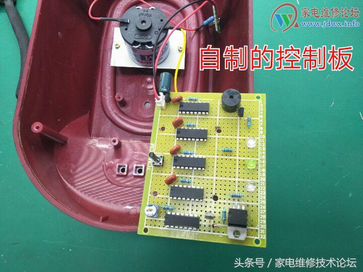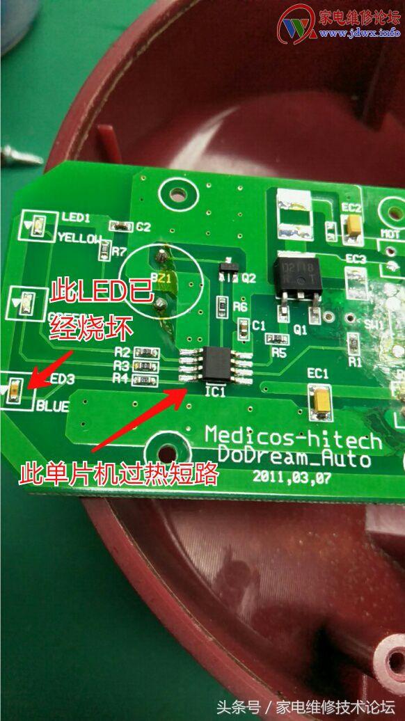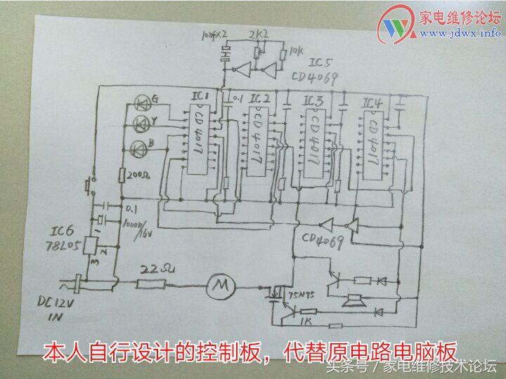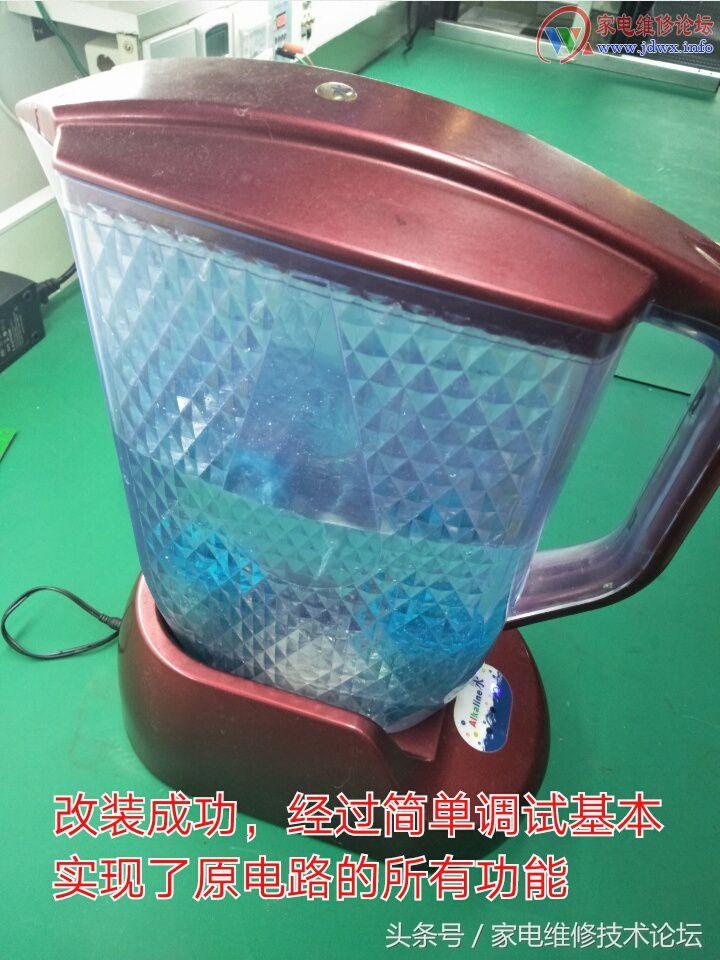 昨天接修一台净水壶,这种净水壶本人第一次接触,经过自己的一番研究和对顾客的询问,净水壶正常工作流程如下:接通12V直流电源适配器,净水壶底座上不放水壶或者水壶里无水的情况下,位于底座上方的轻触开关无压力或者压力很小,轻触开关不能被接通,净水壶电路不工作,当水壶放在底座上并注一定量的水时,水壶的重量迫使轻触开关接通,电路开始工作,底座下边的电机带动磁铁一同旋转,水壶底部的铁悬浮装置开始运动,净水过程开始,同时面板上黄、绿、蓝三个LED依次点亮并循环,16分钟以后LED停止循环,同时蜂鸣器报警,电机停止运转,净水过程结束。
