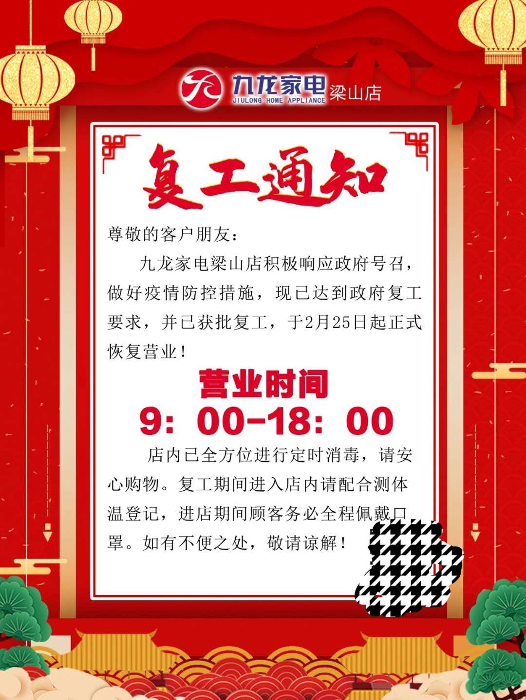 九龙家电梁山店复工公告