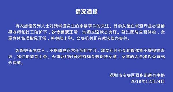 随后西乡街道披露,女童在街道专业心理辅导老师和社工陪护下,饮食睡眠正常,沟通交流状态良好。经过医院全面体检,女童身体各项指标正常,将继续上学。