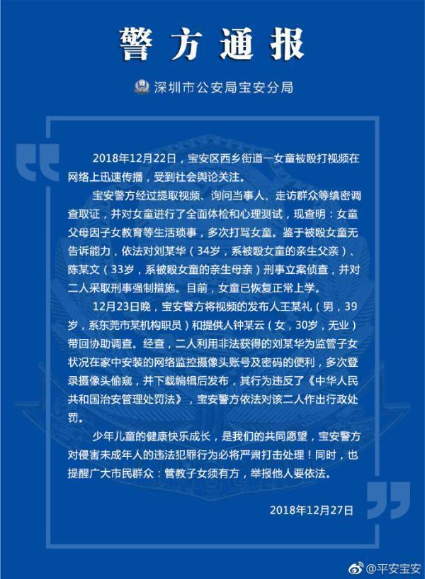 27日晚,深圳警方发布通报,女童父母被采取刑事强制措施,视频发布人王某和提供人钟某被行政处罚。