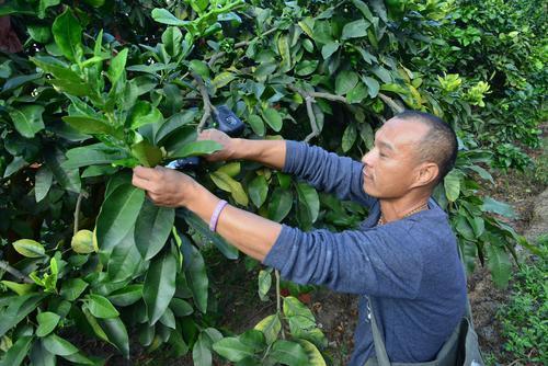 邱国福在果园为柚树修剪树枝。