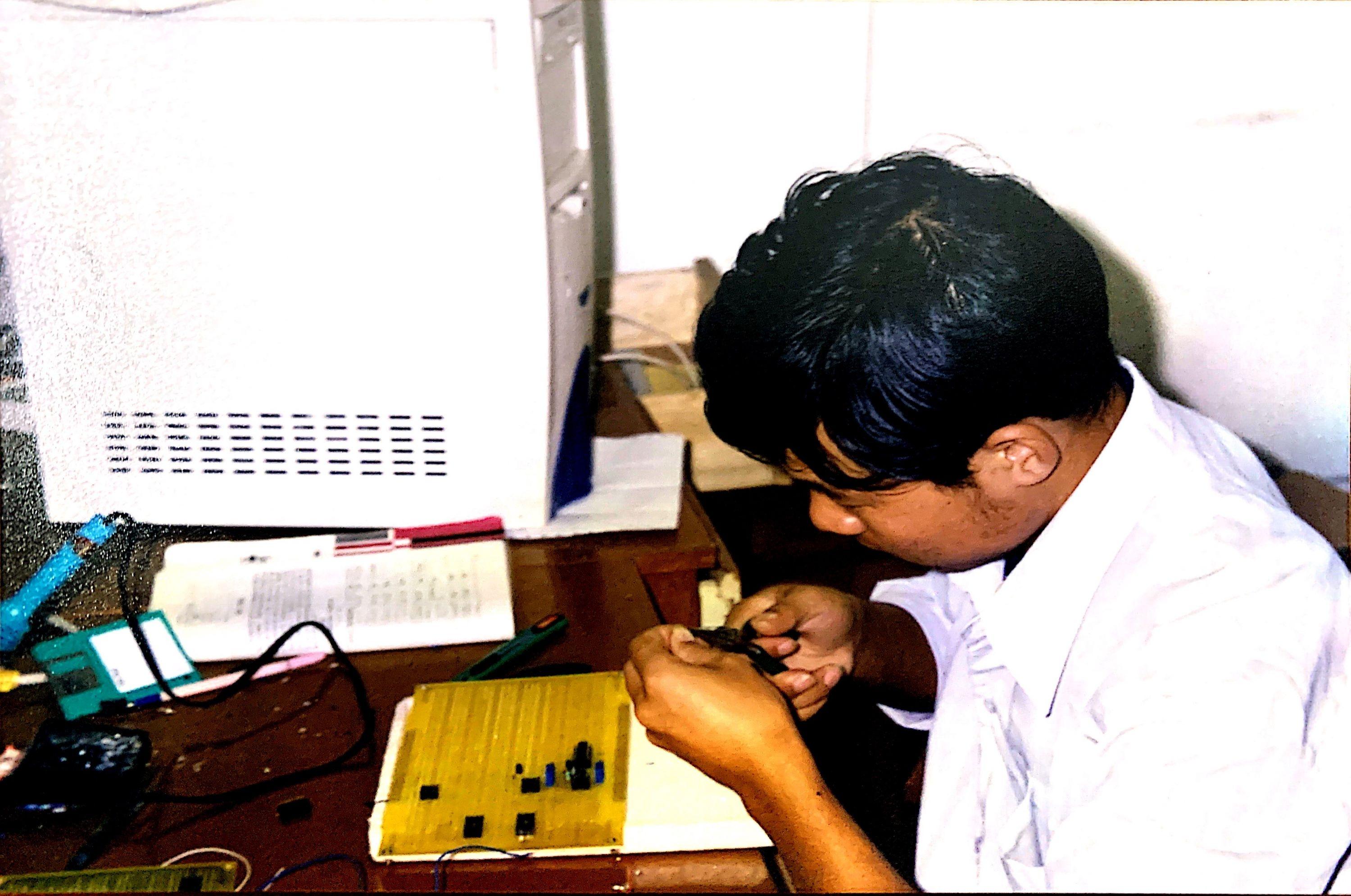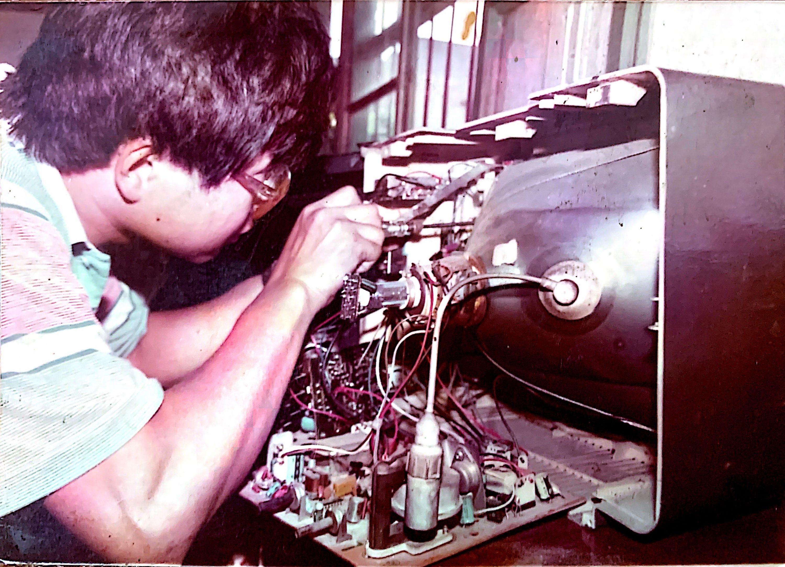 上世纪90年代,蓝电中心志愿队义务维修电视机。湖北工业大学供图