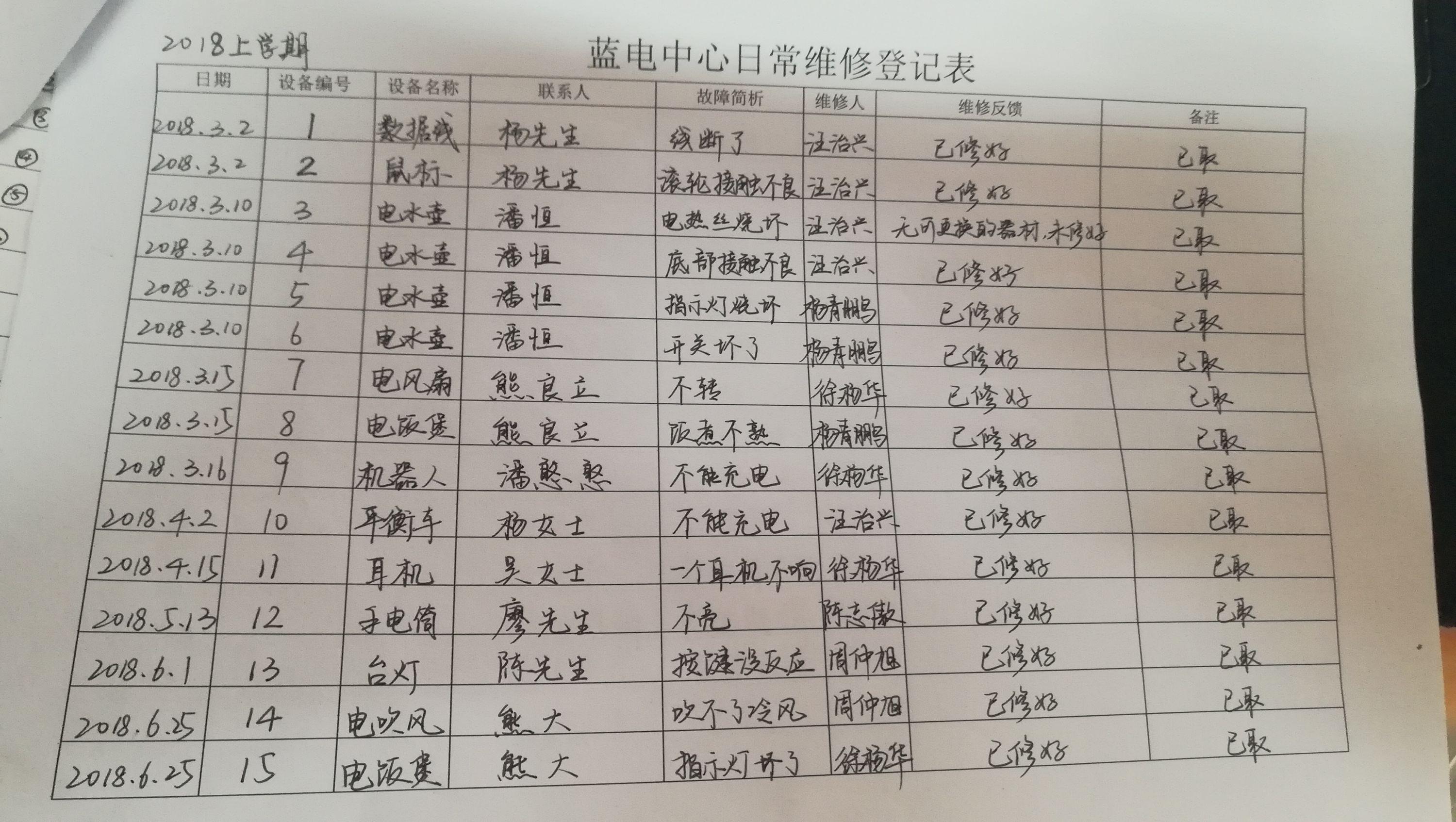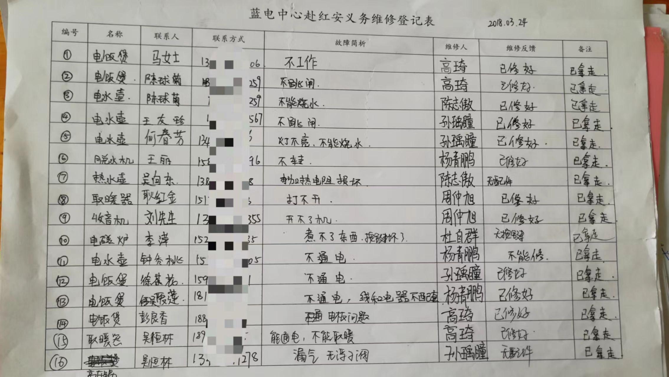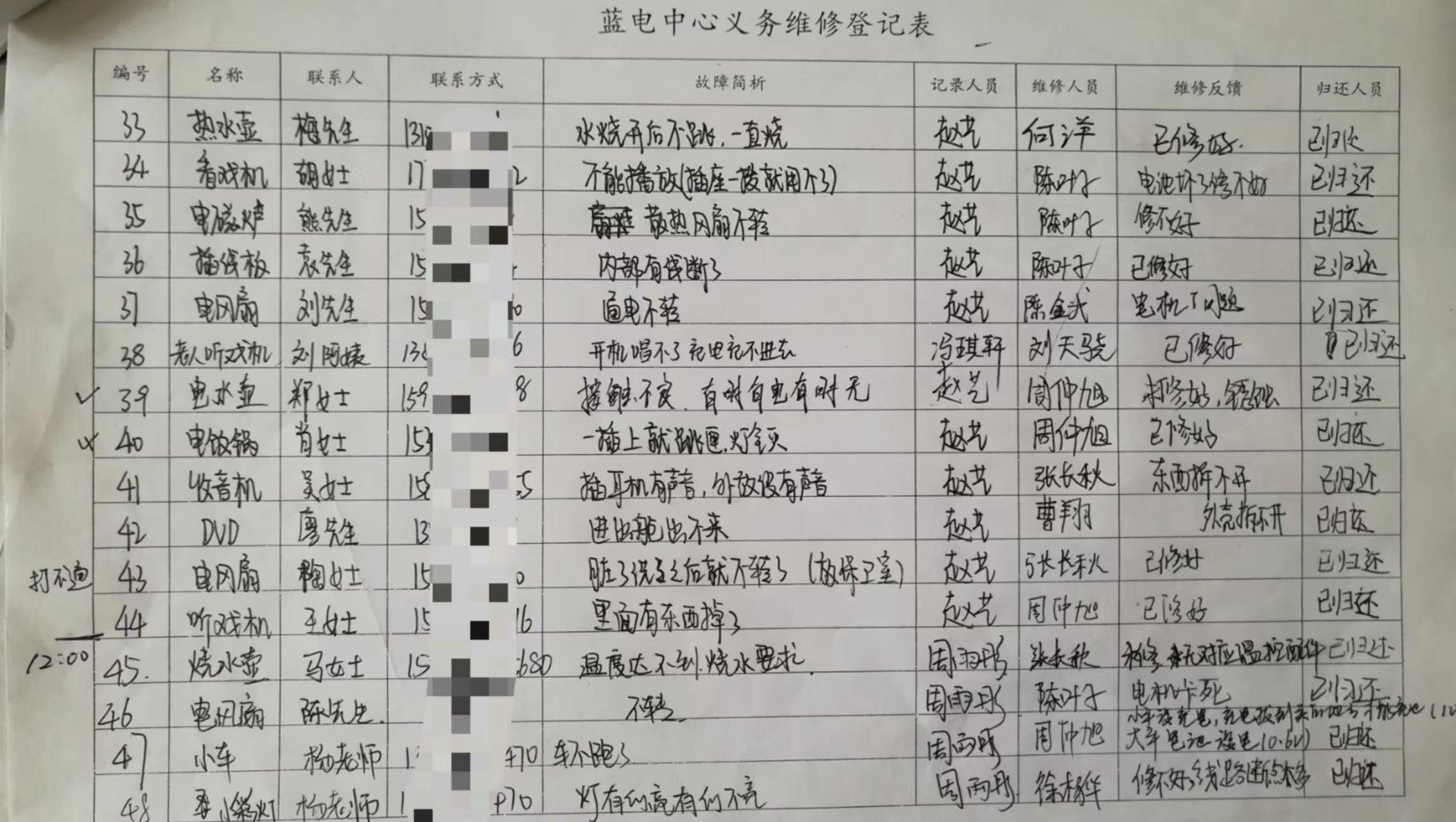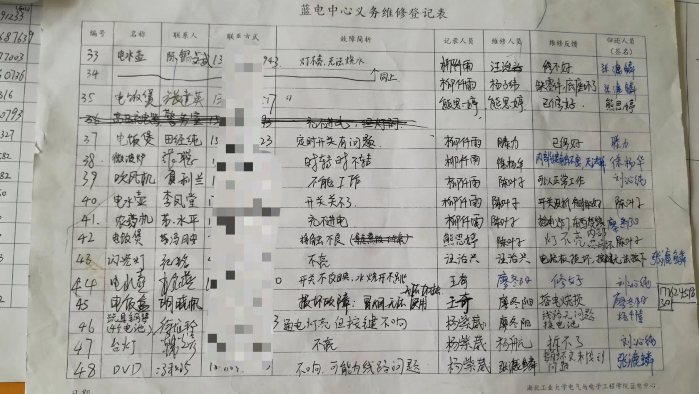 蓝电中心志愿队义务维修登记表。湖北工业大学供图