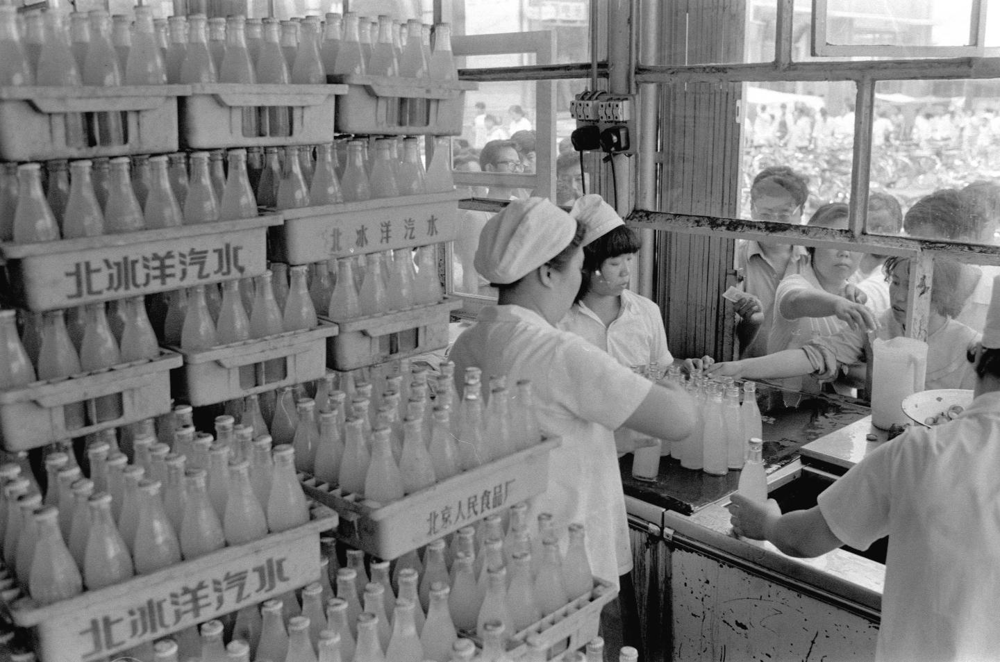 1983年8月,持续高温,冷饮畅销,北京前门大街迎时冷饮店的售货员忙着出售北冰洋汽水。