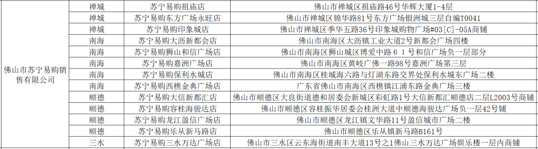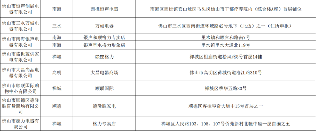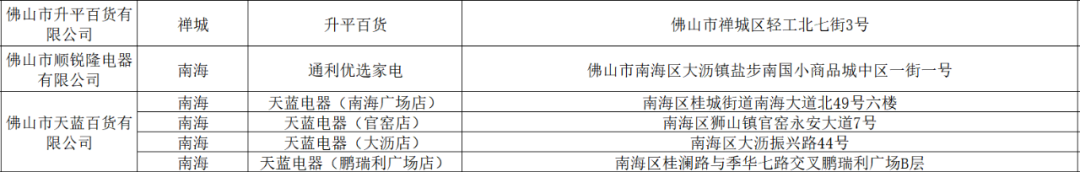 通过企业自愿申报、第三方机构审核、名单公示等程序,佛山市商务局目前已选定两批次共22家企业50个门店 符合要求,消费者到以下门店购买相关家电即享补贴。具体名单如下: