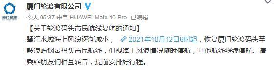 鹭江水域海上风浪逐渐减小,恢复厦门轮渡码头至鼓浪屿钢琴码头市民航线,但视海上风浪情况随时停航,其他航线继续停航。
