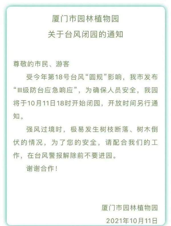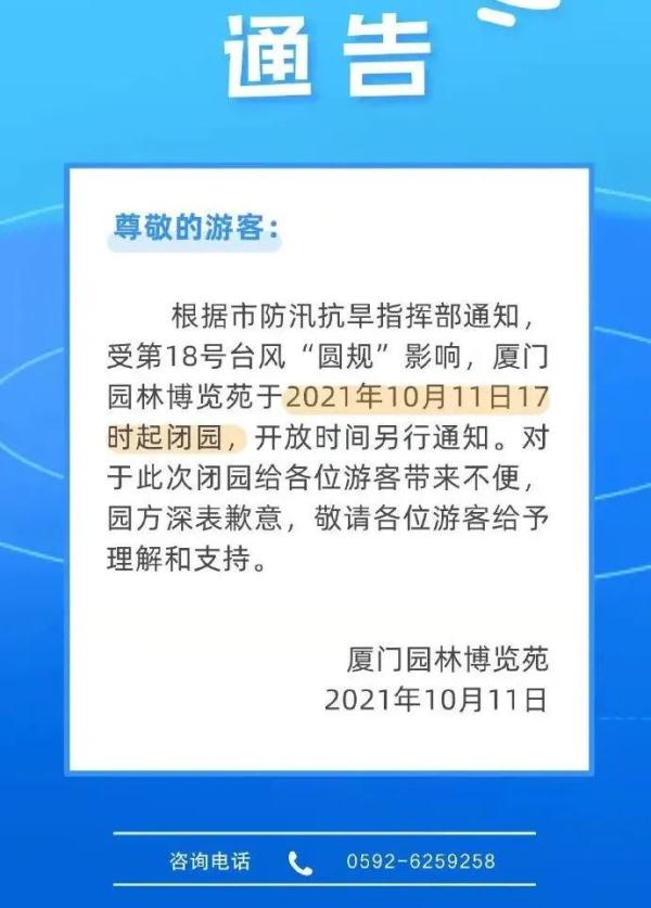 受今年第18号台风“圆规”影响,根据上级部门部署及要求,为确保广大市民游客的人身和财产安全,香山省级风景名胜区将于10月11日20时开始进行闭园。同时景区内商户、游客疏散至安全区域,及时切断户外电源。请广大市民游客给予理解和支持,另行安排在厦旅游行程,并注意台风动态,确保旅游安全,开园时间另行通知。