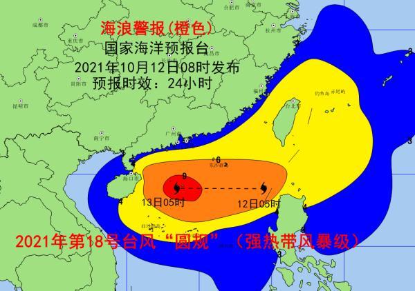 受今年第18号台风“圆规”(强热带风暴级)和冷空气的共同影响,预计:10月12日中午到13日中午,台湾海峡、巴士海峡、台湾以东洋面将出现4到6米的巨浪到狂浪区,该近海海域海浪预警级别为黄色;南海北部将出现6到9米的狂浪到狂涛区,该近海海域海浪预警级别为橙色。浙江近岸海域将出现2到3米的中浪到大浪,该近岸海域海浪预警级别为蓝色;福建、广东近岸海域将出现3到4米的大浪到巨浪,该近岸海域海浪预警级别为黄色;海南东部近岸海域将出现3到4.5米的大浪到巨浪,该近岸海域海浪预警级别为橙色。