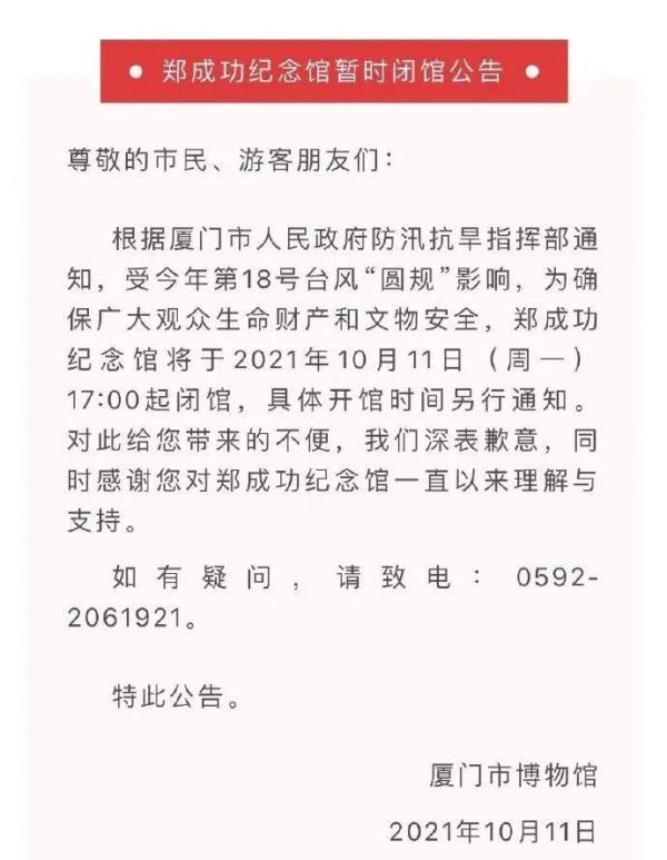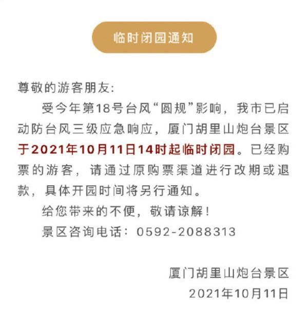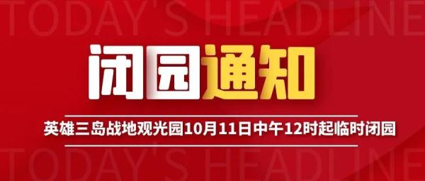 受第18号台风“圆规”影响,我市启动防台风三级应急响应。按照翔安区防汛抗旱指挥部办公室通知要求,为保障游客安全,英雄三岛战地观光园将于10月11日中午12时开始闭园。恢复开园时间将根据实际情况另行通知,详情请关注园区官宣微信。由此给您带来的不便,敬请谅解!
