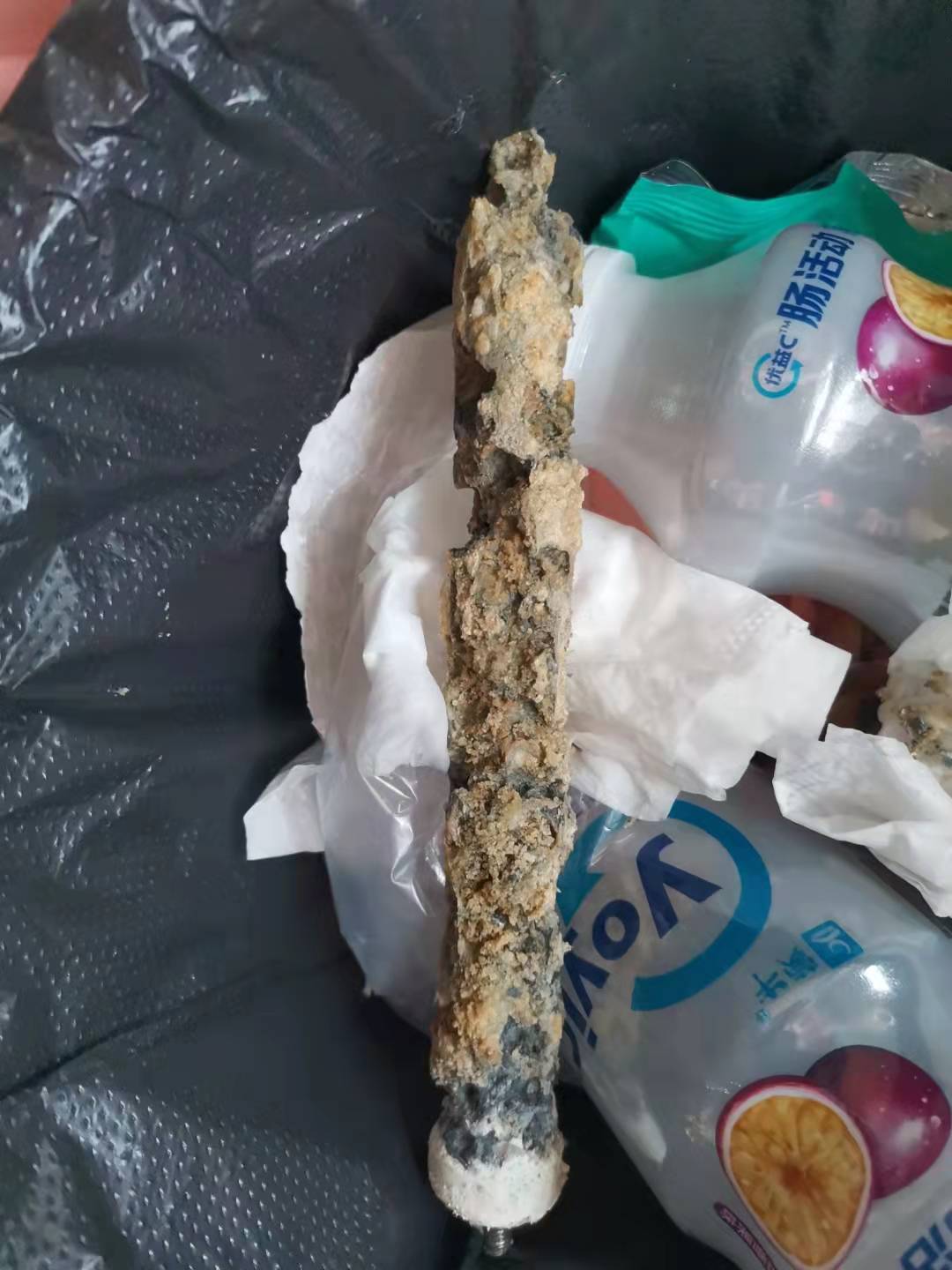 配件买齐了之后,终于在一个风和日丽的上午,开始我的工程。首先要在前天就将热水器断电(在后面更换配件的过程,热水器也必须在断电的状态),然后尽量将热水用完,因为换配件要排空热水器里面的水,如果里面有热水,很容易被烫伤。将旧的混水器拆下来,需要小心用力,不能损害到热水器上面的螺牙。然后用扳手将热水器排污口拆下来,因为很长时间没有更换过,镁棒上被腐蚀很严重,而且水垢很多,用老虎钳夹住下端慢慢往外拔,拆下来的镁棒如下图:
