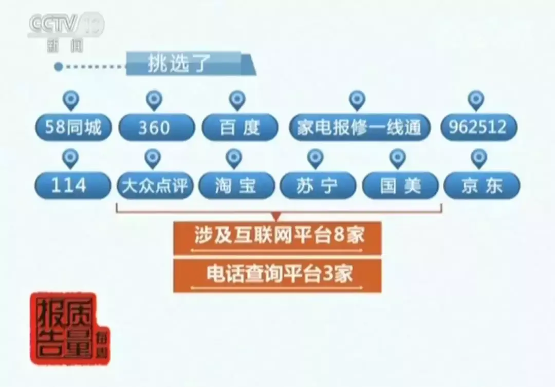 此次,上海市消保委家电专业办联合徐汇区消保委,根据消费者的消费习惯,挑选了360、百度、家电报修一线通、962512、114、大众点评、58同城、淘宝、苏宁、国美、京东等11家平台作为体察对象,涉及互联网平台8家、电话查询平台3家,以平台搜索排名靠前的空调维修服务商作为体察对象,相关商户有相当一部分还是平台的推广企业。