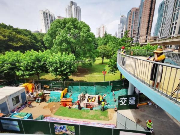 今天上午,记者来到福建路天桥处进行实地探访。记者看到,延安东路福建路路口处已经有一处区域被施工围挡隔离开来。围挡内,数名工作人员在现场正有序进行着切割、电焊等施工步骤。