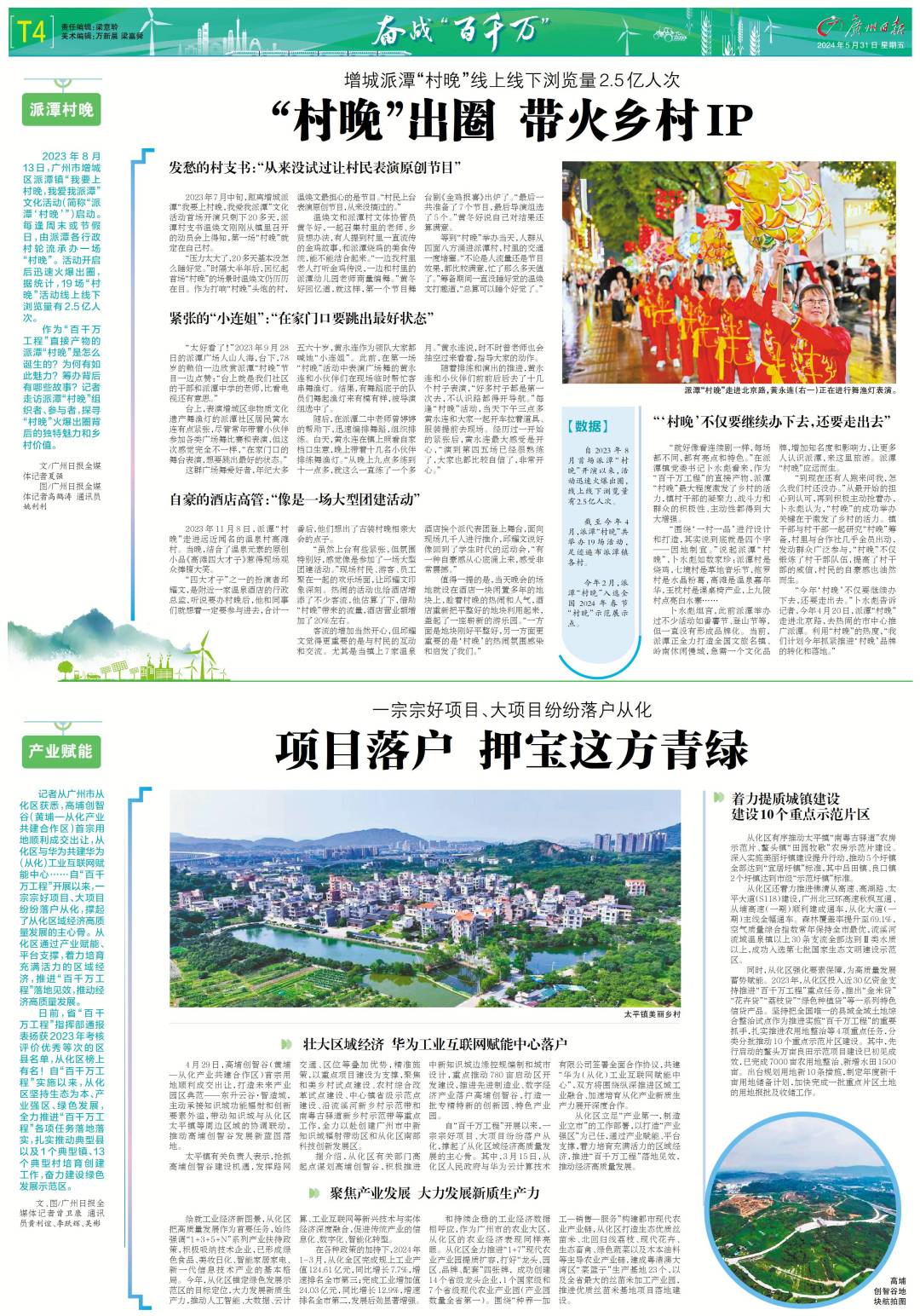 记者从广州市从化区获悉,高埔创智谷(黄埔—从化产业共建合作区)首宗用地顺利成交出让,从化区与华为共建华为(从化)工业互联网赋能中心……自“百千万工程”开展以来,一宗宗好项目、大项目纷纷落户从化,撑起了从化区域经济高质量发展的主心骨。从化区通过产业赋能、平台支撑,着力培育充满活力的区域经济,推进“百千万工程”落地见效,推动经济高质量发展。