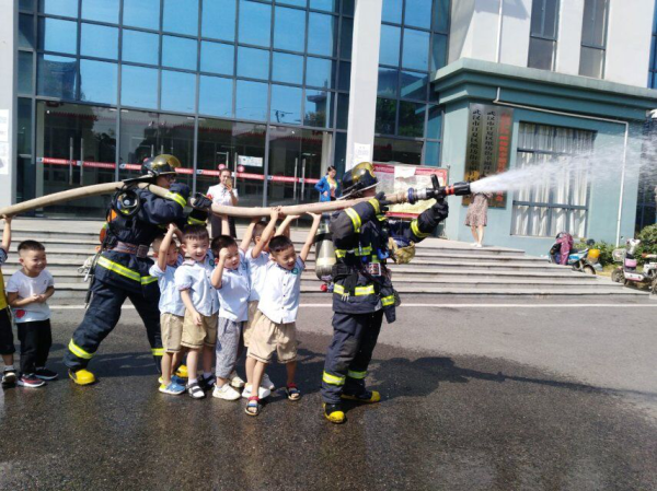 (图为小朋友和消防队员一起参加消防演习。通讯员彭桂荣 供图)