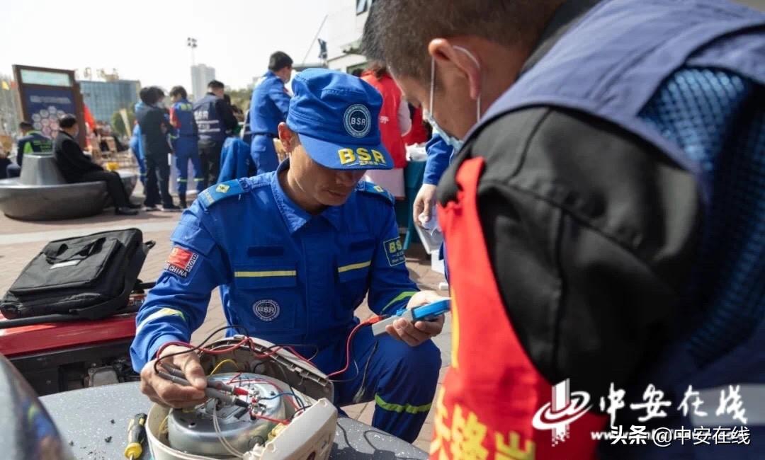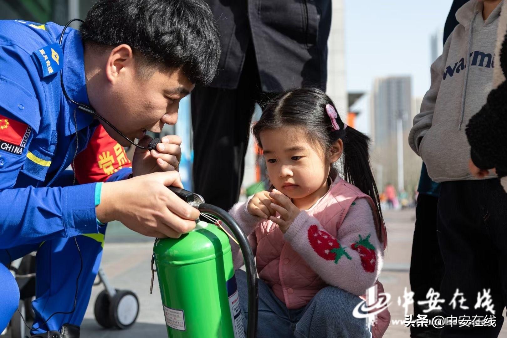 在消防安全宣讲项目的点位前,卞磊磊等两位队友正在向过往群众认真讲解消防安全知识,传授灭火器的正确用法。小朋友们也在爸爸妈妈的带领下,亲手体验灭火器的操作方法。一位小朋友在学习完灭火器的使用方法后,向两位讲解的队员深深鞠躬致谢,并用稚嫩的声音说道:“长大了我也要当救援队员!”