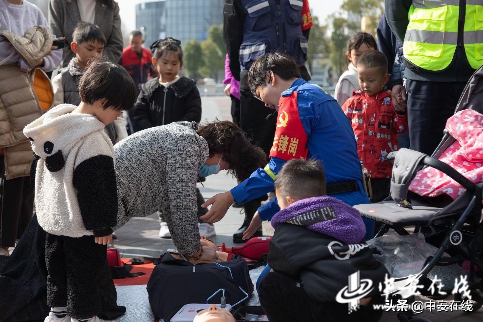 首先,是合肥市蓝天救援队党支部书记刘晓冬主持的急救知识宣讲项目。刘晓冬边讲边示范,向群众们讲解心肺复苏技术的操作要领。群众们一边拍照摄像记录,一边与刘晓冬互动,学习相关技术要领。小朋友们更是勇敢地走上前来,在爸爸妈妈的陪同下,进行操作演练。